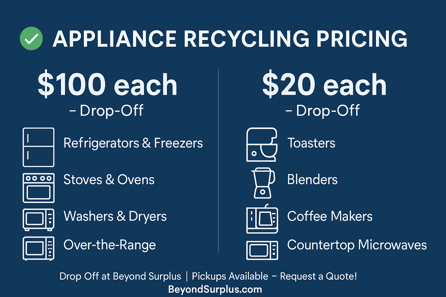 Congratulations you ended here because you are searching for a reputable local electronic recycling company Offering Appliance Recycling Drop Off in the Atlanta Metro Area & Georgia. At Beyond Surplus, we believe Recycling should not be complicated.
