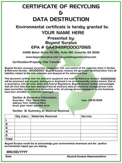 (Beyond Surplus is the only Recycler in Georgia that offers a written guarantee that the equipment will be recycled responsibly, the receipt also serves as transfer of liability, at no cost)